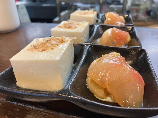 お通しは、こだわり豆腐のヤッコとピリ辛漬け。