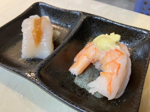 お通しは、帆立の梅ソース&蒸し海老の柚子胡椒マヨソース。