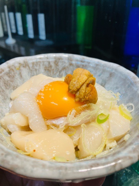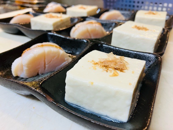 お通しは、帆立梅肉ソースと こだわり豆腐のヤッコ。