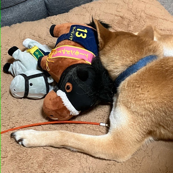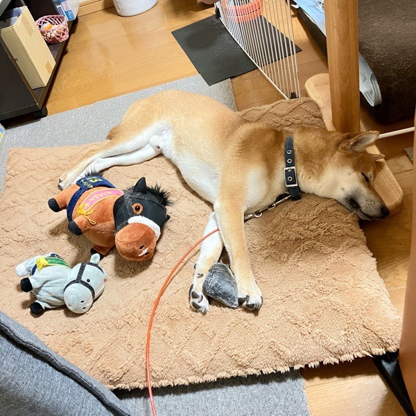 御飯食べまして、自分で引っ張り出してきた お友達の お馬さんとシンクロして お昼寝タイム💤