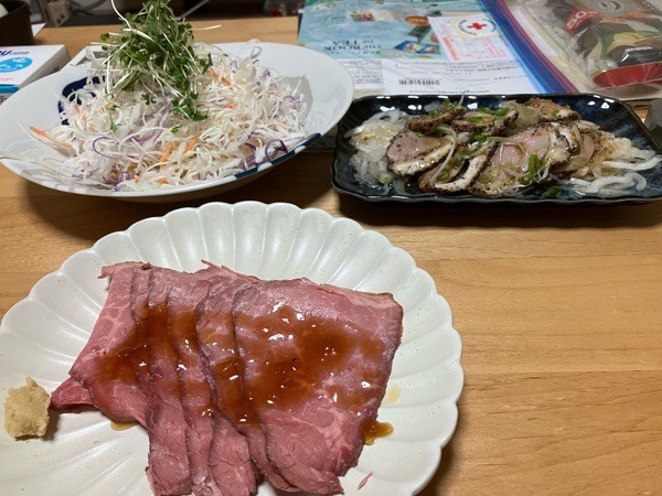 夜の晩酌タイムの係に任命されましたので、スーパーで50%オフでした ローストビーフ。