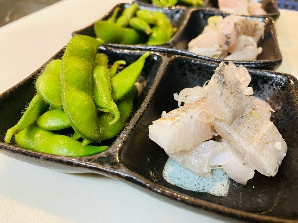 お通しは、地元枝豆と太刀魚の塩ユッケ。