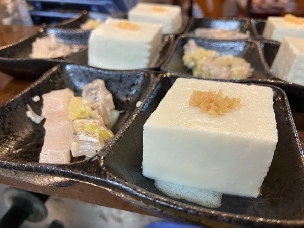スタートの お通しは、こだわり豆腐のヤッコと煮牡蠣。