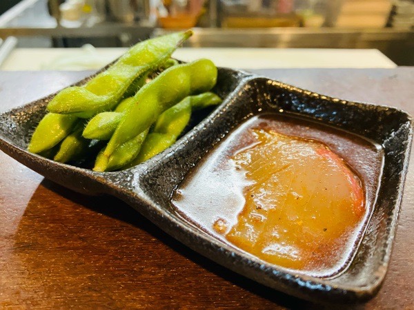 地元枝豆と汐子ユッケが お通し。