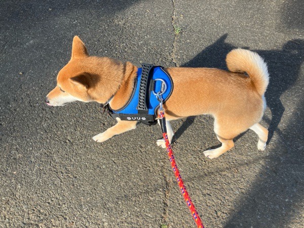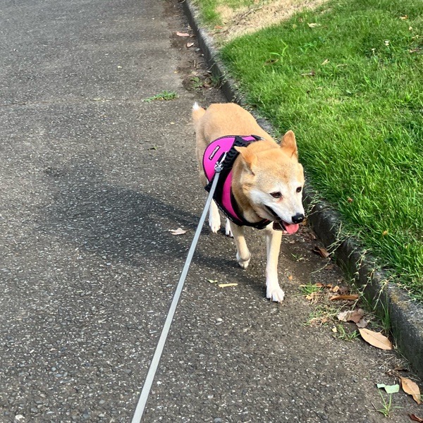 行くよー!と言っても 来ないな〜と振り向きましたら 見事に リードが体に絡み、そして そのリードがソファーに引っかかっておりました😂