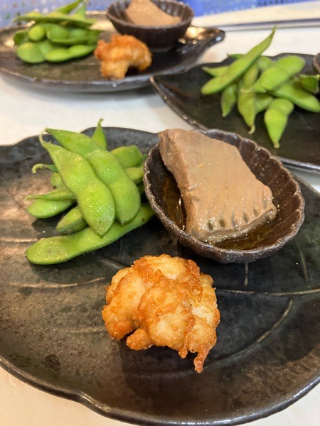 地元産 枝豆、鱧の唐揚げ、鮪の角煮の お通しからー。