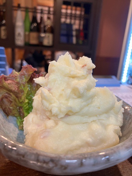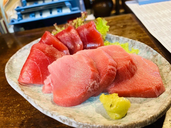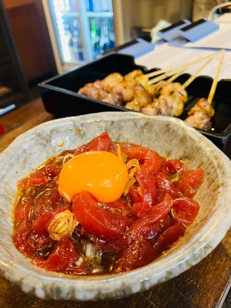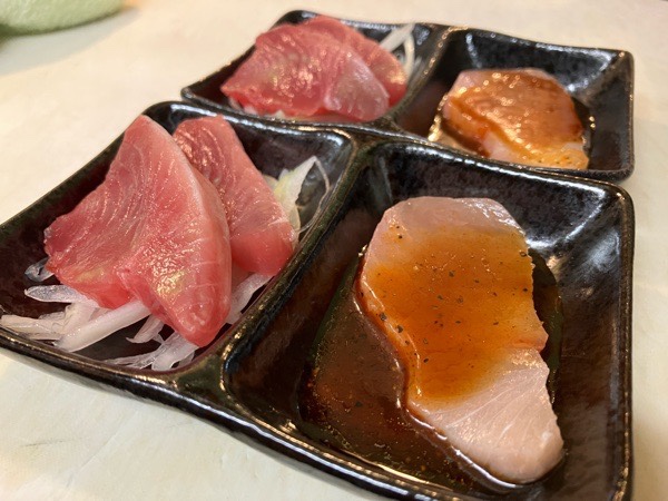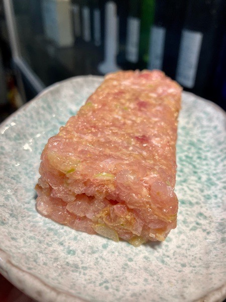 お通しは、ポン酢で食べる鰹とワラサのユッケ。