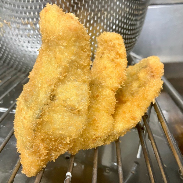 しかし、そんな新鮮な活魚をフライにして揚げますと、身は ふっくら厚みを出しまして、鮮度抜群で身が そり返ります😆