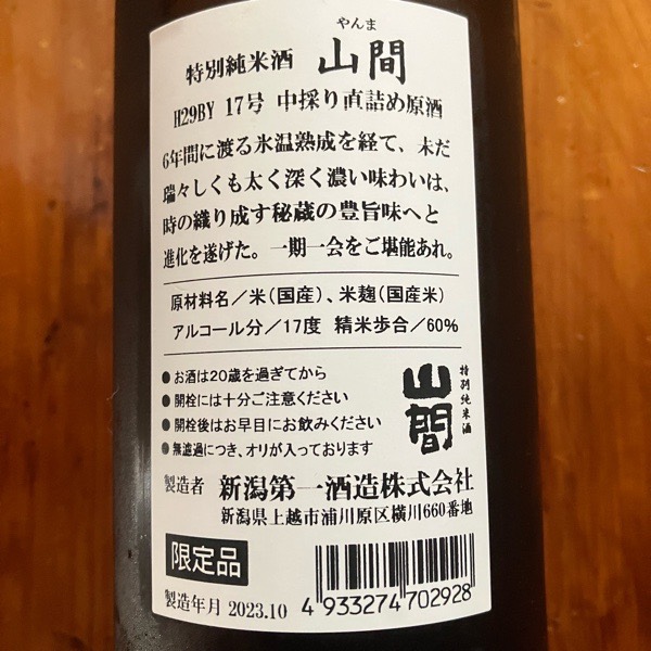 山間 特別純米 H29BY 17号 中探り直詰め原酒
