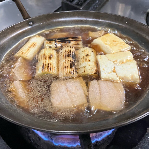 ねぎま鍋は、葱を炭火で焼いてから作ります。