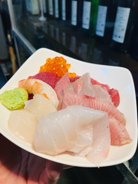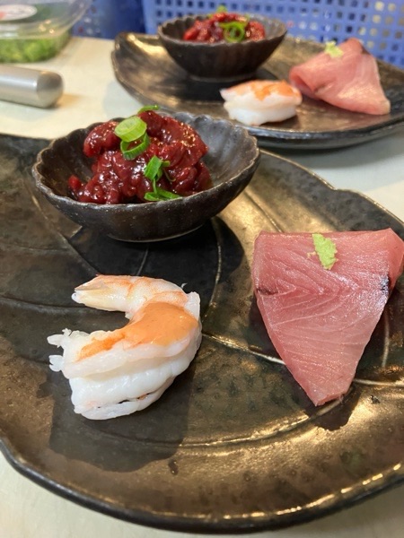 お通しは、豪華バージョンで 桜ユッケ・蒸し海老・ブリの生ハム。