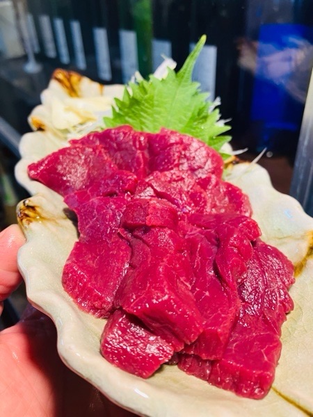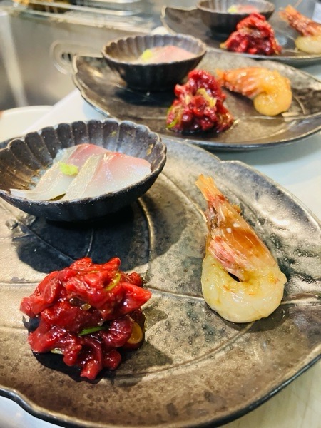 お通しは、贅沢仕様で 自家製〆関サバ・桜ユッケ・漬け牡丹海老。