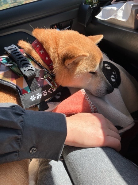 まだ車酔いする感じの みるく先生は、奥さんの膝の上が一番フィットするようです☺️