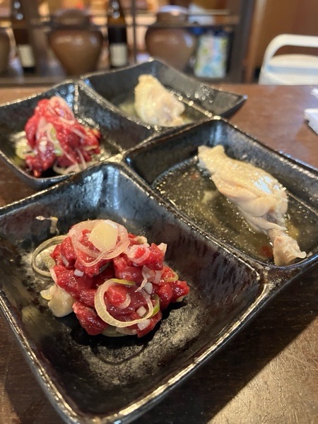 会津馬刺しと桜ユッケのハーフ&ハーフ。