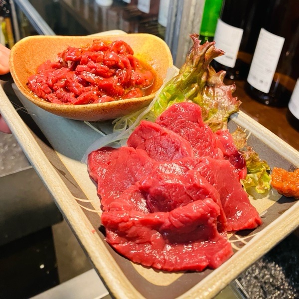 会津馬刺しと桜ユッケのハーフ&ハーフ。