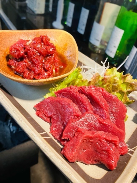 会津馬刺しと桜ユッケのハーフ&ハーフ。