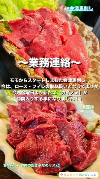 会津馬刺し・モモから始まりました当店ですが、今では より良い物をという事で、ロース・フィレを御提供させて頂いております。
