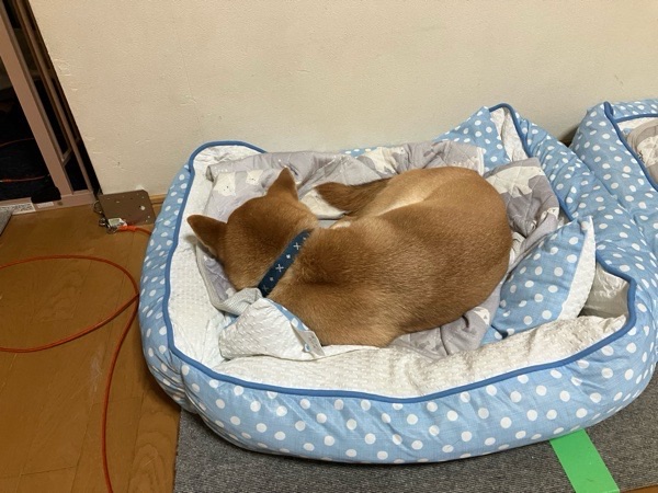 みるく先生は、畳んだ瞬ぴぃの布団で爆睡😪