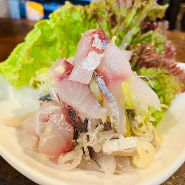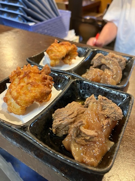 お通しは、鱧の唐揚げと馬赤スジ煮込み。