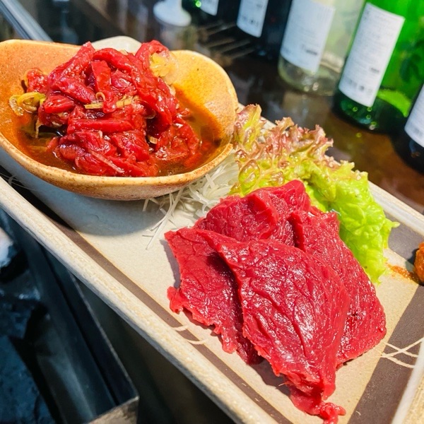 会津馬刺しと桜ユッケのハーフ&ハーフ。