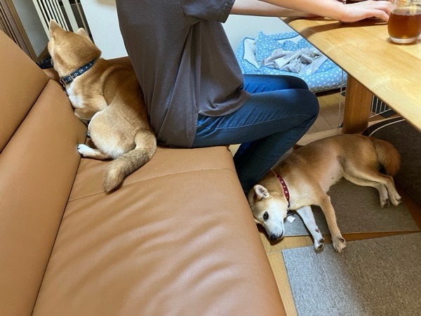 朝御飯を食べまして、ワッチャカコンビは どんだけ奥様に くっ付けるかの競い合い😂