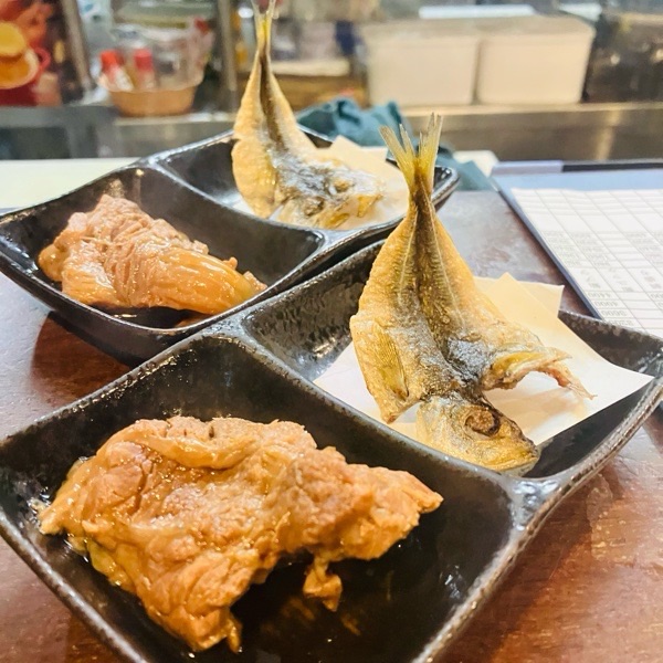 お通しは、馬の赤スジ煮と小田原産豆アジ。