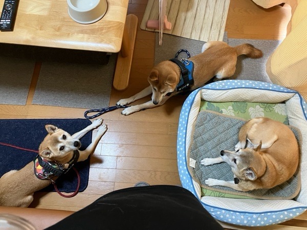 お散歩から帰って来まして、トライアングルで 御飯待ち△