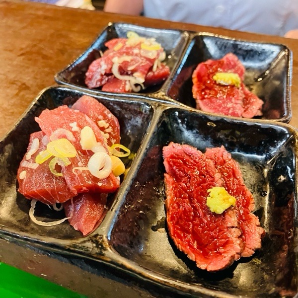 お通しは、マグロの塩ユッケと馬肉タタキと豪華版🤗