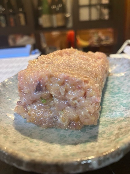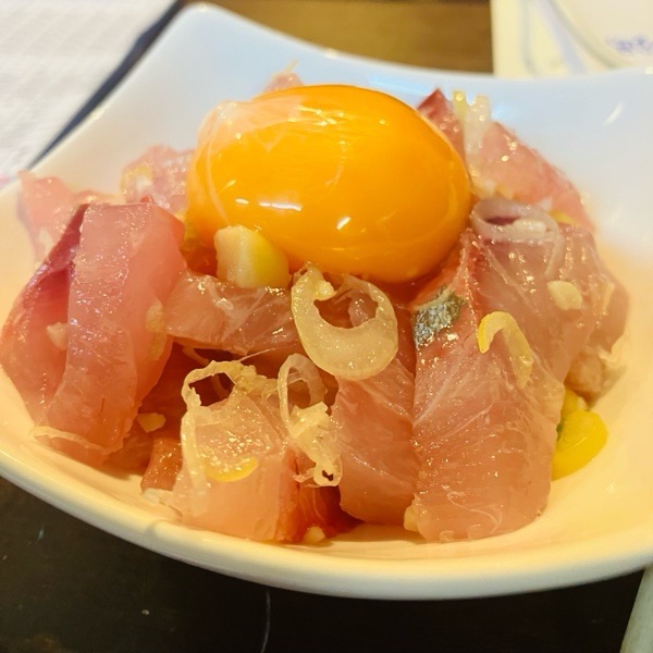 縞鯵の塩ユッケ。