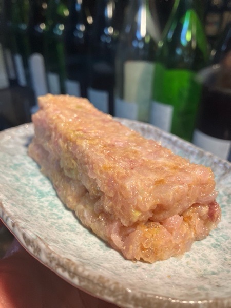 マグロの塩ユッケと鮪の頬肉の塩炊きが お通し。