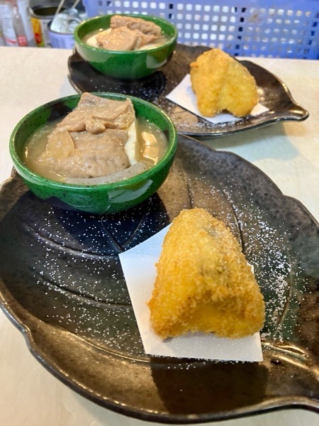 特製 豚の大トロもつ煮と極厚椎茸フライが お通しでした。