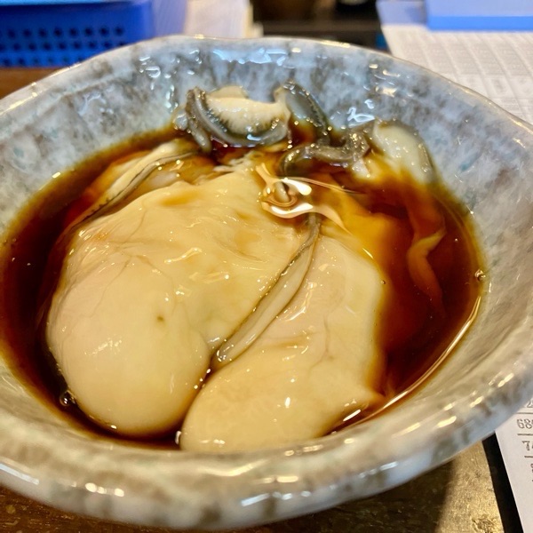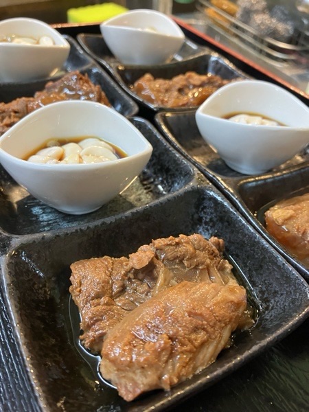 お通しは、白子ポン酢と馬の赤スジ煮込み。