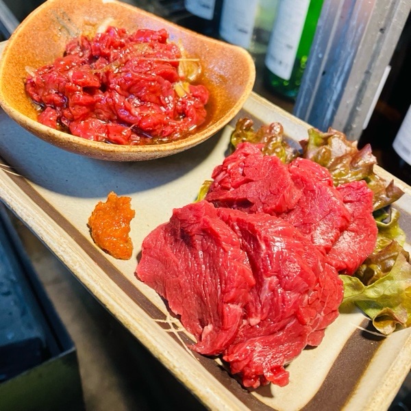 会津馬刺しと桜ユッケのハーフ&ハーフ。