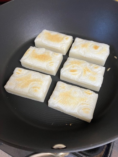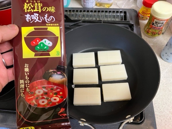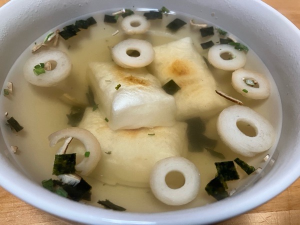 こんがり お餅を焼きまして、お吸い物の素でー!