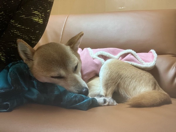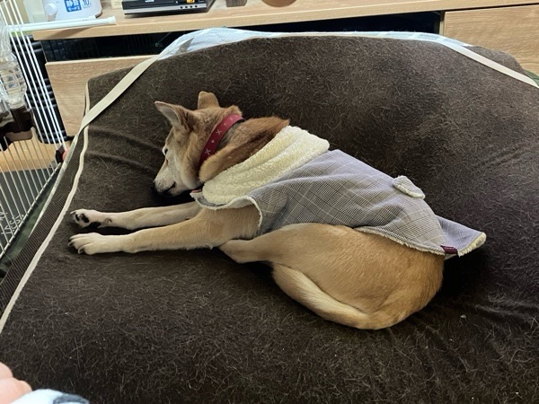裸ん坊の時は丸くなって寝てましたが、洋服一枚で違いが出ている感じで伸び〜ぃ😪