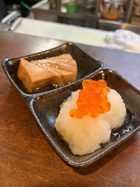 マグロの角煮とイクラおろしが お通し。