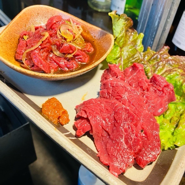 会津馬刺しと桜ユッケのハーフ&ハーフ。