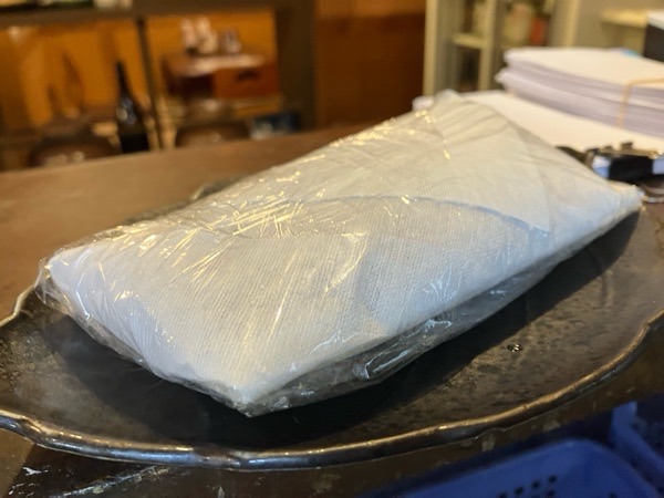 スルメイカは、塩辛用でございますので、肝に塩を打ちまして 1日寝かします。