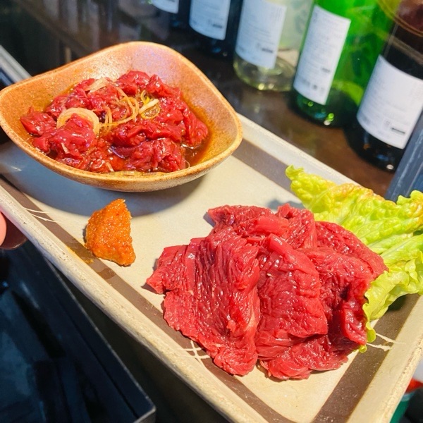 会津馬刺しと桜ユッケのハーフ&ハーフ。