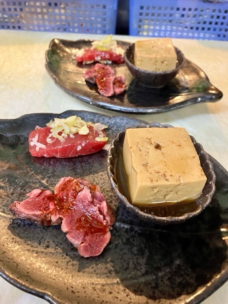 馬出汁煮豆腐・本鮪塩ユッケ・馬肉タタキが お通し。