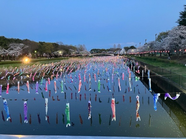 せっかく満開でしたので、ライトアップされた桜と鯉のぼりを見に🎏