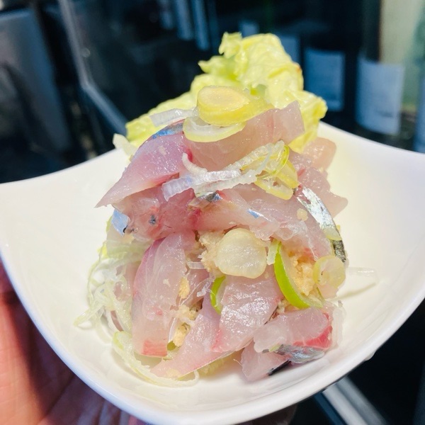 オススメメニューの活〆釣り真鯵のタタキ。