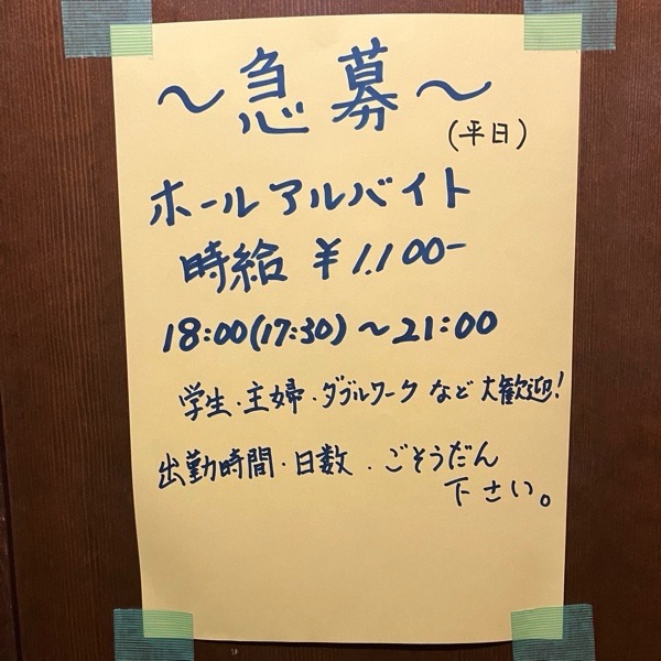 只今、当店 平日のホールアルバイトスタッフを募集しております。