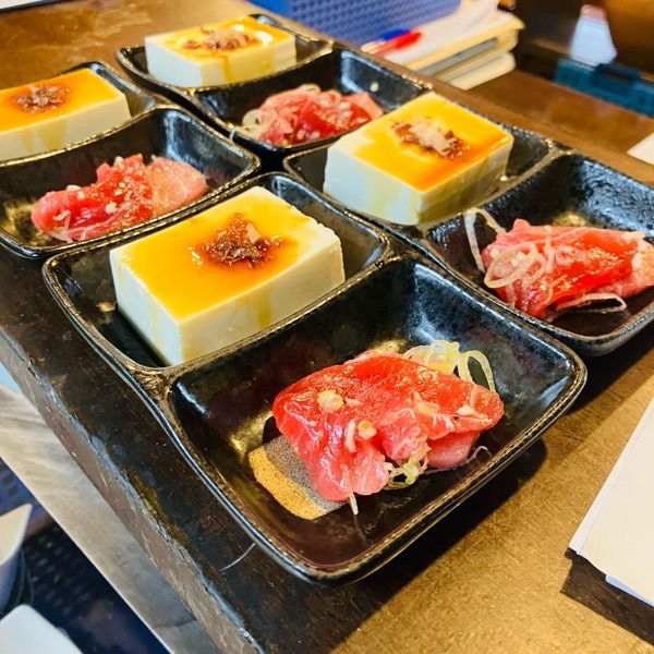 オススメメニューのマグロが 鹿児島産 天然本鮪になりましたので、熟成しましたインドマグロをお通しで出しちゃおう作戦の お通しでした🎶