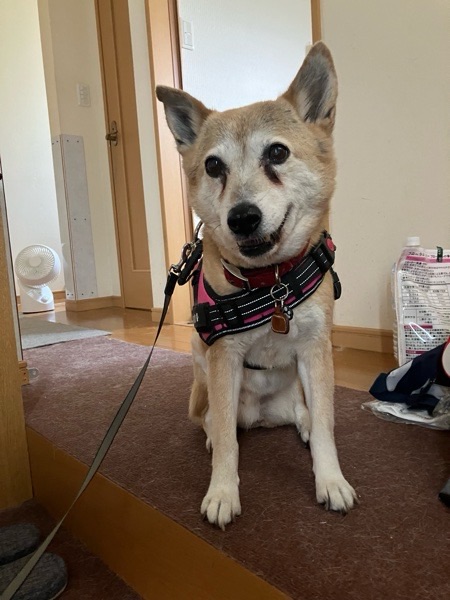 お散歩準備万端のヒバ子さんは、良い子に玄関で座って待機🫡