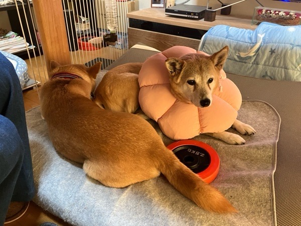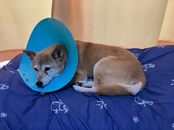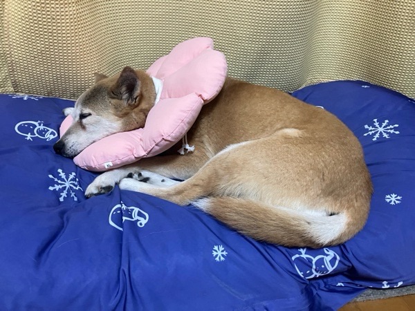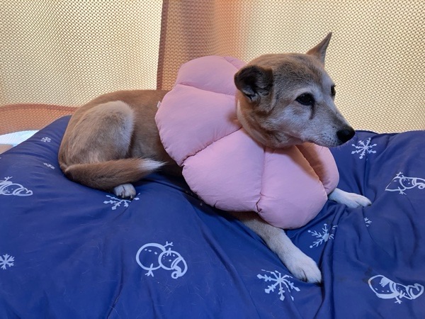 ヒバ子さんのエリザベスカラー、ハードな青色から ソフトなピンクに交換してみました😚