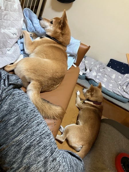 ワッチャカコンビは、洗濯物干しから戻ってくる奥様を起きて待ってました👏