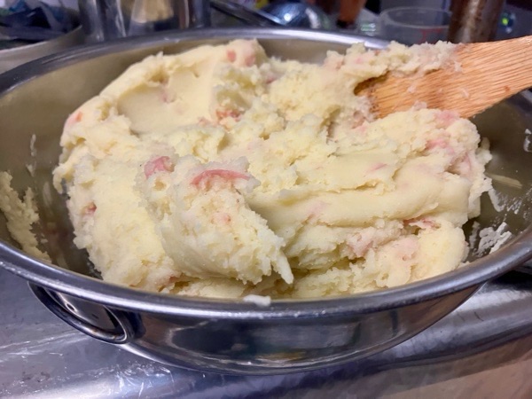 お店の準備へ入りまして、大汗かきながら 人気者の なめらかポテトサラダの仕込み🥵
