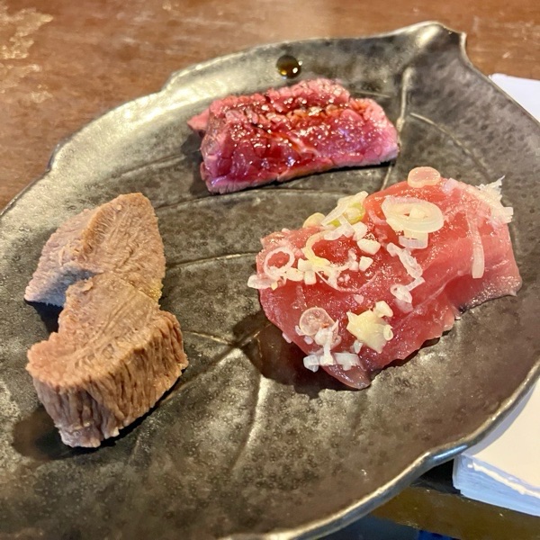 馬タタキ・マグロの塩ユッケ・牛タン煮込みが お通し。