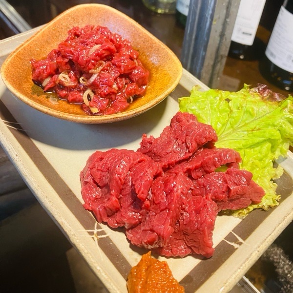 会津馬刺しと桜ユッケのハーフ&ハーフ。